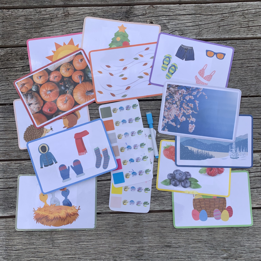 Ze kijken hiervoor naar de randen van de foto's. Ze duiden met een whiteboardstift het jusite seizoen aan en controleren zelf achteraan de prent met de foto op.