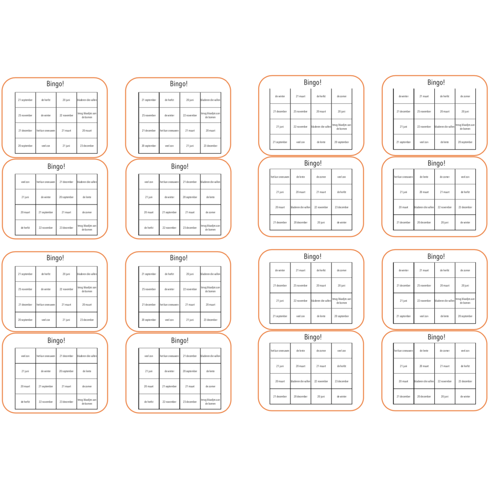 Downloadbare versie van de seizoensbingo, 12 verschillende bingoblaadjes.